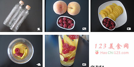 3、黄桃洗净去皮,切片。树莓洗净后晾干。