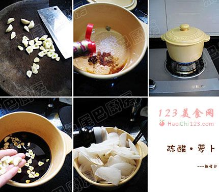 10、倒入沥干水分的萝卜片,盖上锅盖,腌制两天便可食用。