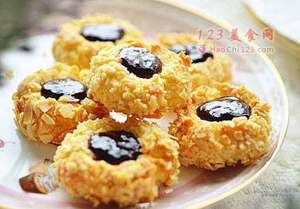 8、杏仁片用擀面杖压碎,将沾了蛋清的面团上均匀沾上一层杏仁碎。
