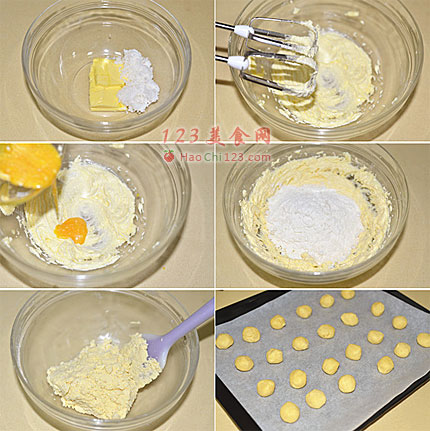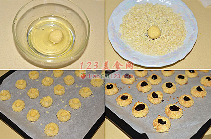 9、间隔着放入铺了油纸的烤盘中,用手指在中间按出凹槽。