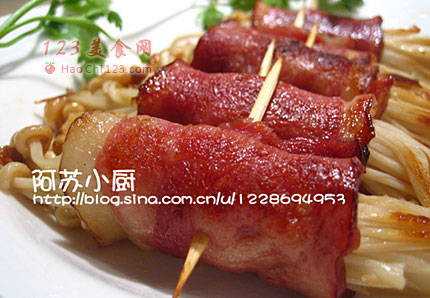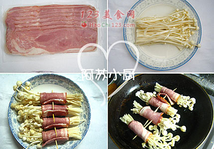 2、锅中放少许橄榄油,烧5成热,放入培根卷煎熟即可(由于培根已经是咸的,所以基本可以不用再放盐了)。