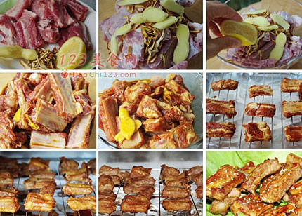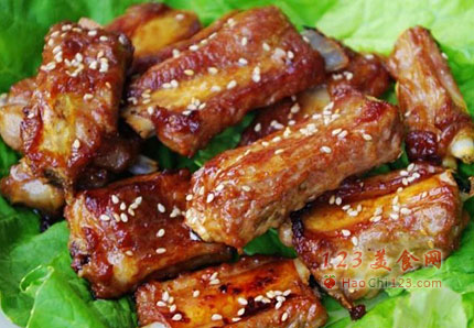 3、烤盘铺上锡纸,将腌制好的排骨放在烤架上,再放入烤箱(烤盘放最下一层接油,烤架放在中层),先用180度的温度烤20分钟,再改成200度烤10分钟即可,出炉的时候撒一点白芝麻。