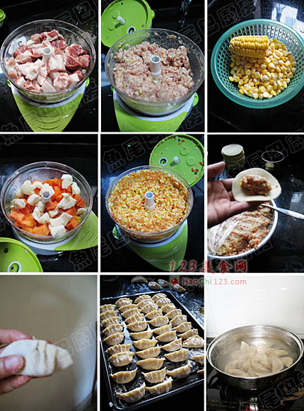 3、玉米洗干净掰粒,沥干水分后放入饺子料理器中。