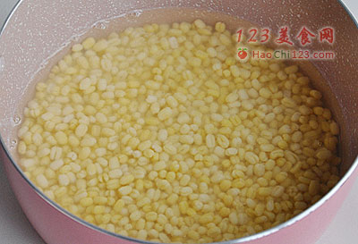 3、再把浸泡过的绿豆冲洗2-3遍。用蒸锅或者高压锅将绿豆蒸熟。绿豆一定要蒸到软烂,用勺子轻轻碾压绿豆、绿豆能很容易就被压碎。