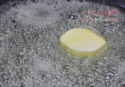 5、取一口干净的不粘锅,放入黄油,加热至黄油融化。
