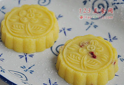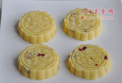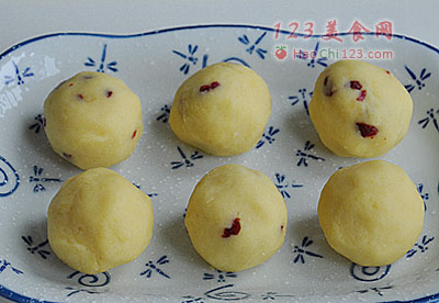 9、待绿豆泥稍凉(不烫手),将绿豆泥分成等份的小团子。我根据我用的模具,是分的45g一个的小团子。将蔓越莓干切碎,取适量与绿豆泥混合,捏成小团子,码放整齐。不加蔓越莓干的就是原味的绿豆糕。