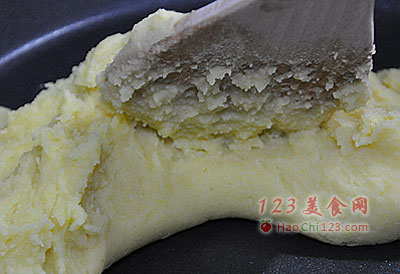 7、一直保持小火,用锅铲不停翻炒,让绿豆泥中的水分渐渐蒸发。这一步极为考验臂力,建议由家里的壮劳力来做,如果自己炒可以在心里默念“甩肉甩肉”来持续不断地鼓励自己。火千万别大了,否则很容易糊,做出的绿豆糕就不漂亮了。