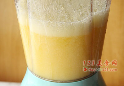 3、备好的雪梨和橙子放入机器中,加入纯净水,盖好杯盖,先按开关按钮,再按果汁按钮,机器工作2-3分钟后会听到哔哔的提示声,果汁制作完毕。