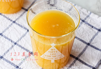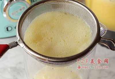 4、将制好的果汁用过滤网过滤,倒入杯中加蜂蜜拌匀即可饮用。
