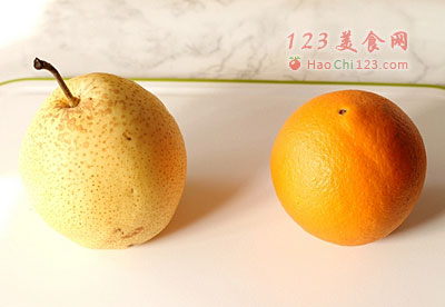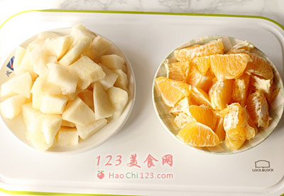 2、雪梨洗净,去皮去核,切成块;橙子洗净,去皮,将果肉切成块。