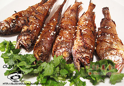 9、烤好的黄花鱼放入盘中撒适量香菜末和白芝麻即可食用。