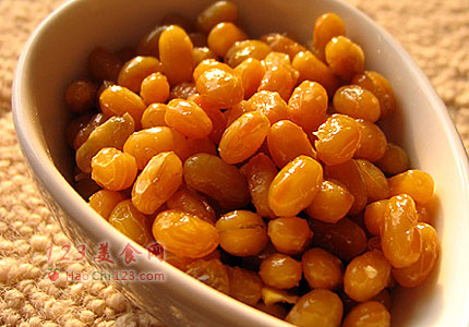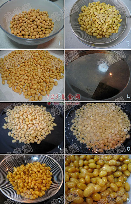 2、4-5图,锅中倒入足够的油,冷油时就把黄豆放入,中小火加热。