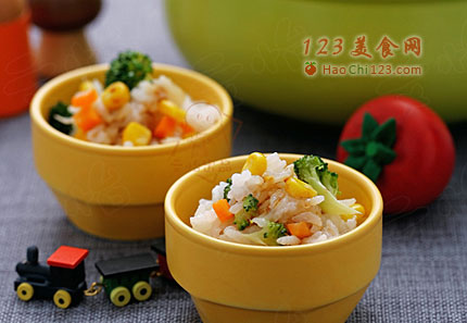 5、20分钟后带隔热手套打开盖子,加入西兰花和玉米粒,盖上盖子,再焖5分钟就可以了,盛出后加一点点宝宝酱油或者一点点盐提味(加料前妈妈先尝一尝哦)。