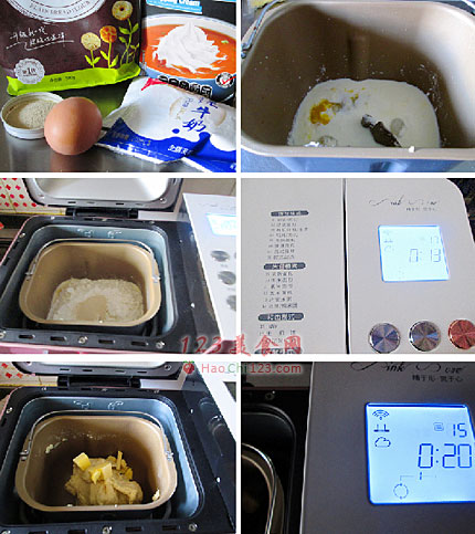 3、加入面粉后加入酵母。将面包桶放置面包机中固定好。