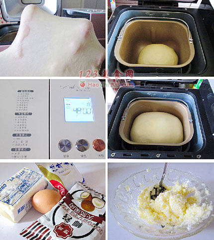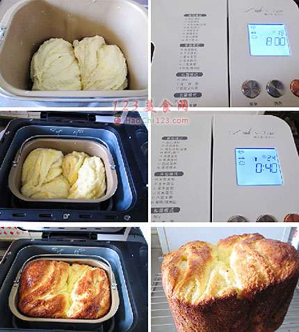 贴士:自定义揉面比较柔和,加入黄油后用iMix功能力度比较大,这样使黄油更快的融入面团中。也是面团更好的柔出筋膜来。发酵时间根据室温来调节。由于面包运用的黄油较多,上色较快,我提前5分钟结束程序。[sushi.laoyanhuo.com]
