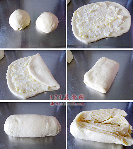 17、再擀成长条状,从一头卷起。