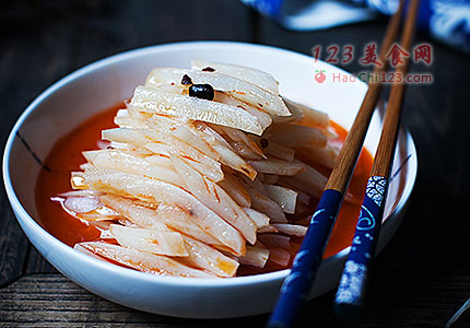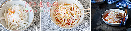 4、5、藕丝充分沥干,加所有调料拌匀,入冰箱冷藏半天会更入味更好吃。