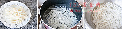 2、锅内水烧开,倒入藕丝焯烫不超过1分钟(时间不要长,影响口感)。