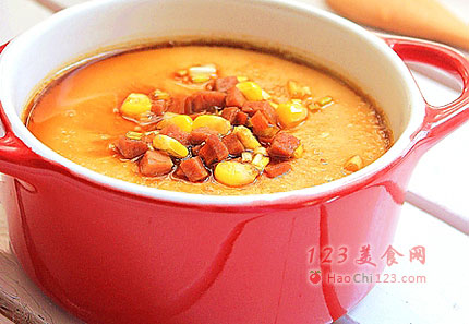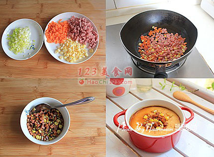 7、甜玉米剥粒、香葱、胡萝卜、午餐肉切丁。
