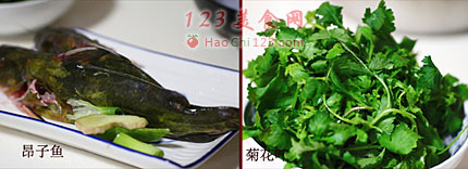 贴士:昂子鱼也有地方称它为黄辣丁,有土腥味,烧鱼时放葱姜蒜和红尖椒是去腥气的。菊叶乃南京特产,是清凉败毒的一种野菜,亦清炒河做汤,不可煮久,汤水一滚即可。[LaoYanHuo.com]