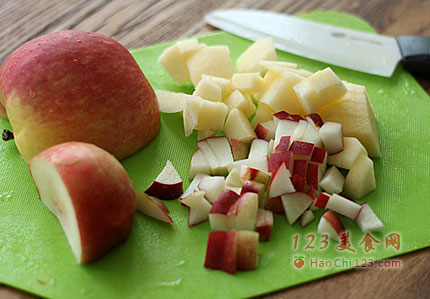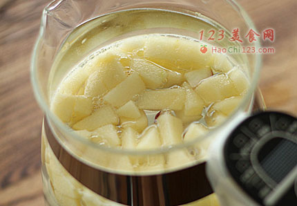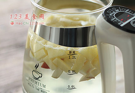 2、壶里加入适量的水,放入苹果,桃子丁。