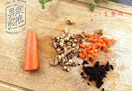 3、老菜脯(陈年萝卜干)、胡萝卜、核桃、莴笋分别切成丁。