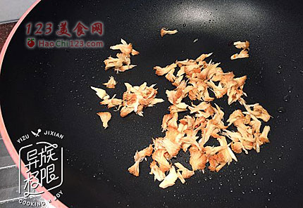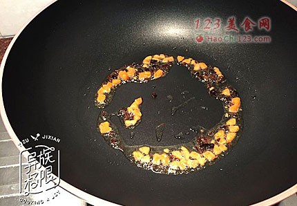 4、起锅,热锅后,放入老菜脯(陈年萝卜干)、胡萝卜超出香味后铲出装碗里。