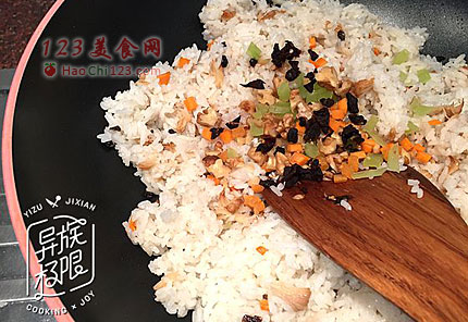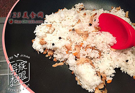 6、把所有食材和米饭分别放入锅中,加盐调味。