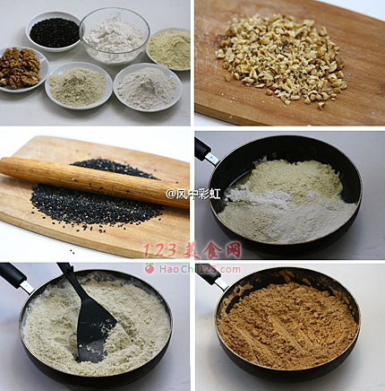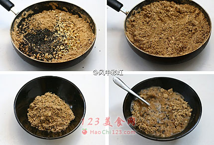 7、炒的过程中,粉的颜色会逐渐变黄、再至褐色,而且能闻到熟面粉的香气,就是炒熟了。