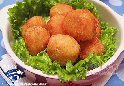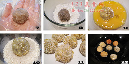 12、锅中倒入食用油、加热至六七成热时,下入虾球,小火炸至金黄色时即可出锅。