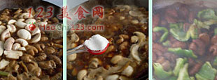 7、锅内加入切好的蘑菇块,加入适量盐,我用的那个小茶匙,放了四茶匙的盐,盖上盖小火慢炖,大概至少要一个多小时(我是用高压锅炖的,用了25分钟左右)炖的时间看实际情况,炖至汤汁浓稠,肥肠软烂就可以了,最后加入青椒块翻炒一下,出锅就可以了。