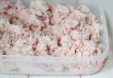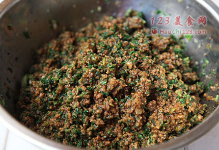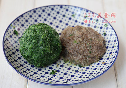 3、将香菇、油菜和葱、姜分别放入搅拌机中铰碎,继续攥出水分(自己切碎也可)。