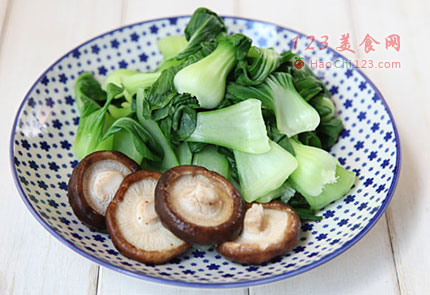 2、香菇、油菜用开水氽烫一下,捞出控水。