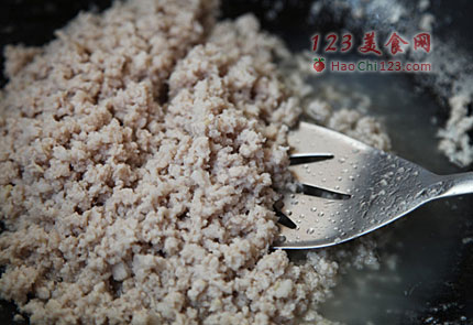 4、锅中倒入少许油,放入花椒炒香捞出,放入葱姜末,将解冻的肉馅放入锅中炒出油(我这个肉比较肥,炒出的油太多,要把油控出去)。