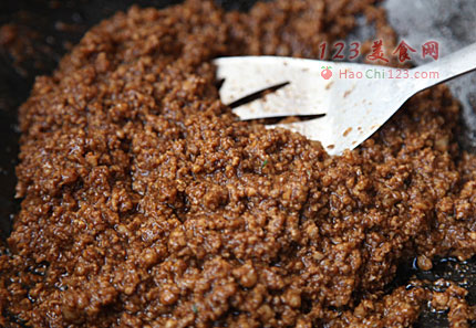 5、放入香菇末翻炒均匀;倒入甜面酱翻炒均匀。