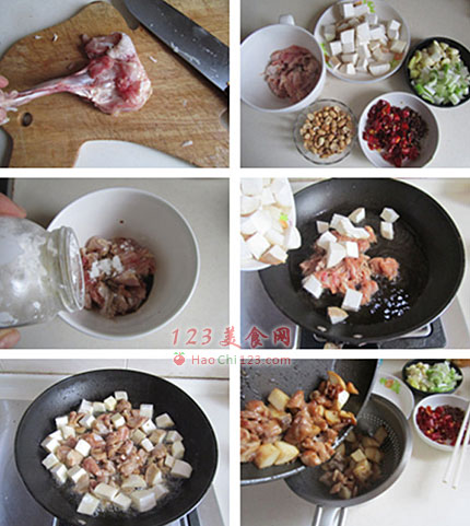 2、鸡丁不要切的太小,比起大拇指盖大一些就可以;杏鲍菇也同样大小;因为油滑后体积会缩小;将它们提前处理至六、七成熟,不要完全熟。