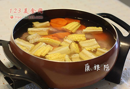 2、玉米切段,胡萝卜削皮切块,把猪骨头、玉米和胡萝卜以及清水一起放在汤锅里,煮沸后转中小火煲30分钟。