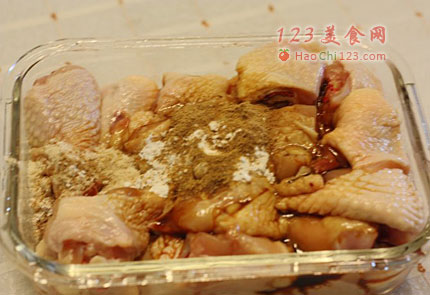 3、在煲汤底时,鸡洗净斩件,将盐、料酒、酱油、姜粉和胡椒粉放入鸡块里,拌匀腌制片刻。