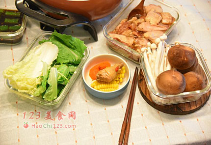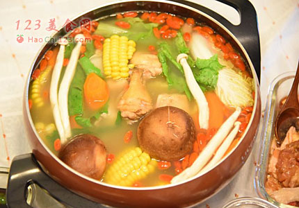 5、汤底煲好后,可以放进鸡块等等烫熟吃。