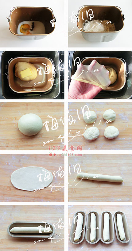 9、烤好的面包,稍冷却后,从中间竖切一刀(不要切断)。