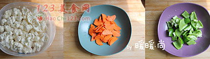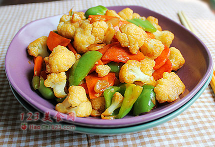2、在将胡萝卜煸炒之后锅内的油会变成漂亮的金黄色,再加入白色的菜花会让整个菜色看起来更漂亮。