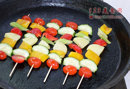 4、平底锅放火上,开小火,将蔬菜串用小刷子两面刷上色拉油,将菜串放锅里两面煎熟。
