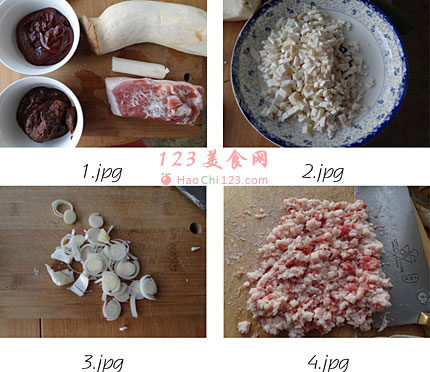 2-4、肉切成肉末,葱切葱花,杏鲍菇切小丁。