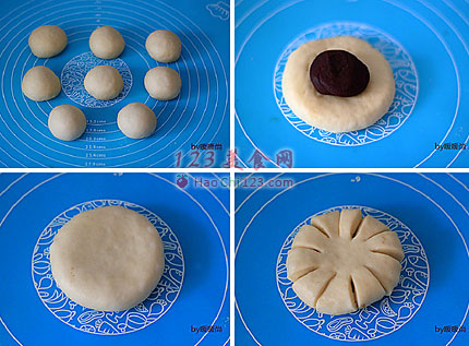 6、将松弛后的面团用手掌摁扁,中间挤上适量的红豆沙。