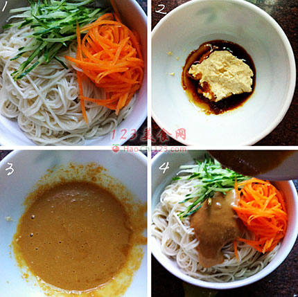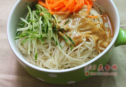 4、把调好的芝麻酱倒在面条上面,拌匀即可。