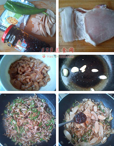 3、热锅下油,放入蒜头煸出香味,加入腌好的肉丝翻炒至变色然后加入青椒炒至肉熟,再跟着放入榨菜、切好的火煺,翻炒几下,然后加入一勺老干妈炒匀,尝一下咸淡(因为榨菜与老干妈都是咸的,所以根据肉丝的份量一定要尝一下咸淡再确定是否需要加盐)。如不咸味合适,炒均后就可以起锅了。