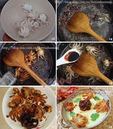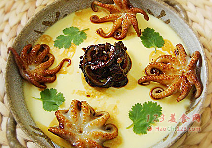 4、加入XO酱与豆瓣酱酱烧的海参与八爪鱼爽脆鲜香,非常美味;蛋羹因年糕、虾米的加入,口感变得更为丰富,鲜香糯滑;而蛋羹因“内有其糕”给年夜饭餐桌上带来上份惊喜;伴着酱烧的海参与八爪鱼又是另一种风味。
