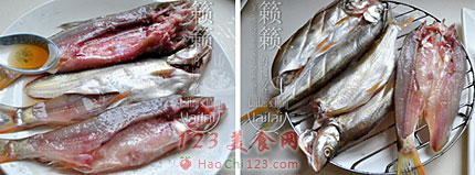 2、将鱼沥干汁水,平铺在网架上爆腌风干,期间最好翻个面,使鱼身两面都尽量风干收水,时间2小时以上,我一般一早腌制风干中午进行烹饪。