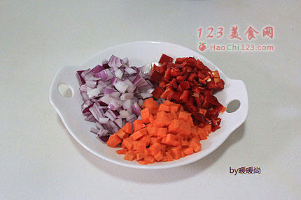 2、洋葱、胡萝卜、红椒洗净切丁。