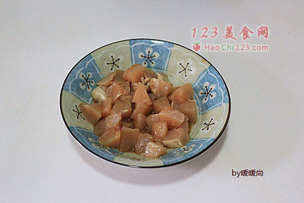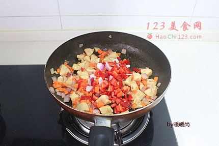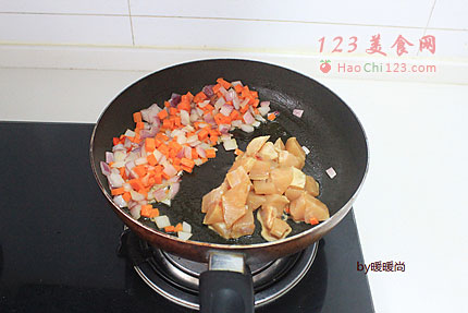 5、将洋葱和胡萝卜拨到一边,下鸡胸肉翻炒至变色。
